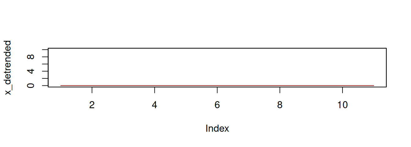 If we apply ts_preprocessing() to this time series, the result shows a horizontal line, which is a perfect linear detrending. Now we can be sure our implementation works!