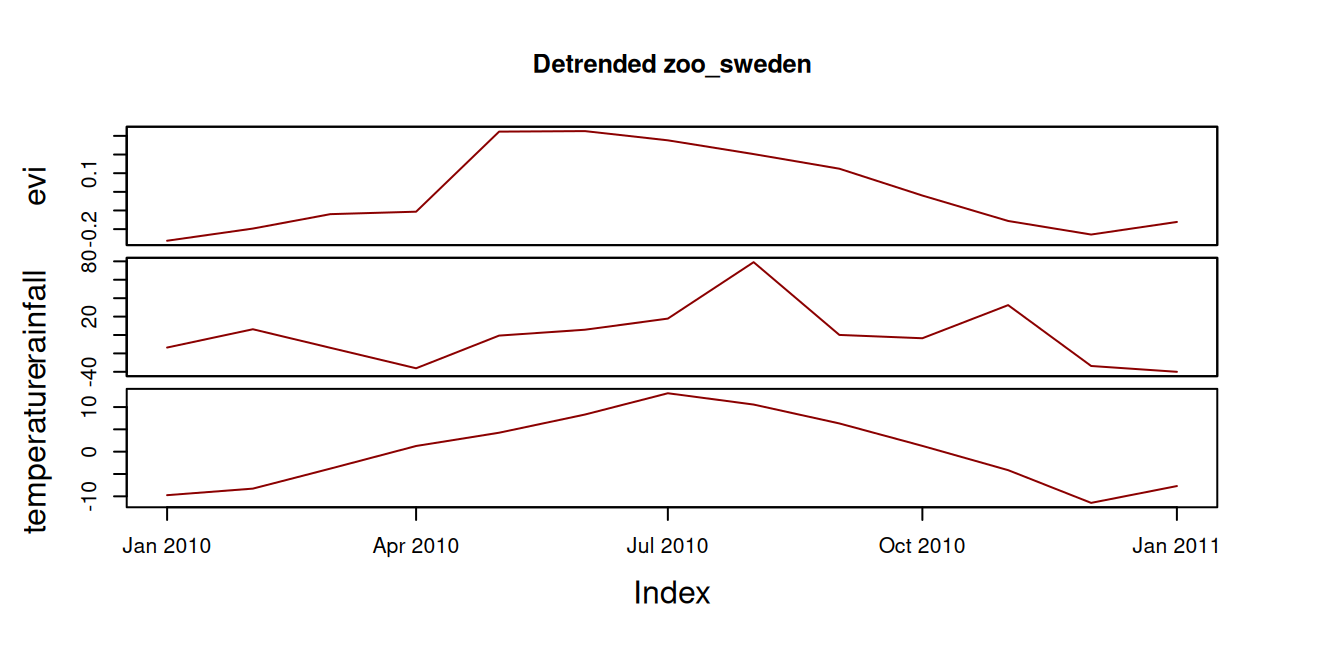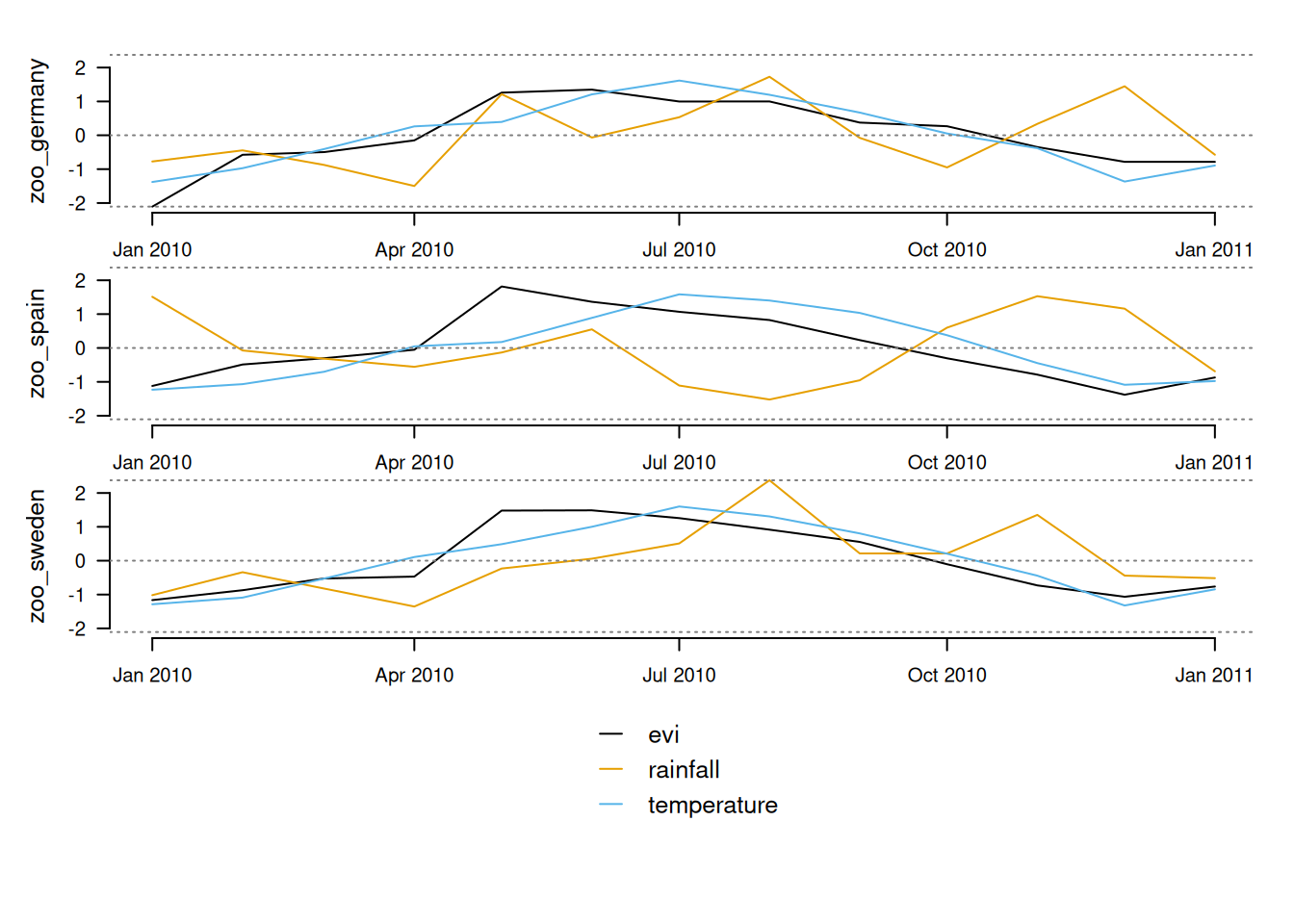 Having good example data at hand is a must when developing new code. For this tutorial we use three multivariate time series of temperature, rainfall, and normalized vegetation index. These time series are named zoo_germany, zoo_sweden, and zoo_spain, and are stored as objects of the class