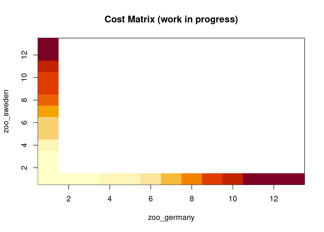 And now, when comparing zoo_sweden with zoo_spain we should expect an even higher dissimilarity score, given that they are quite far apart. As a bonus, we let the function plot their alignment.