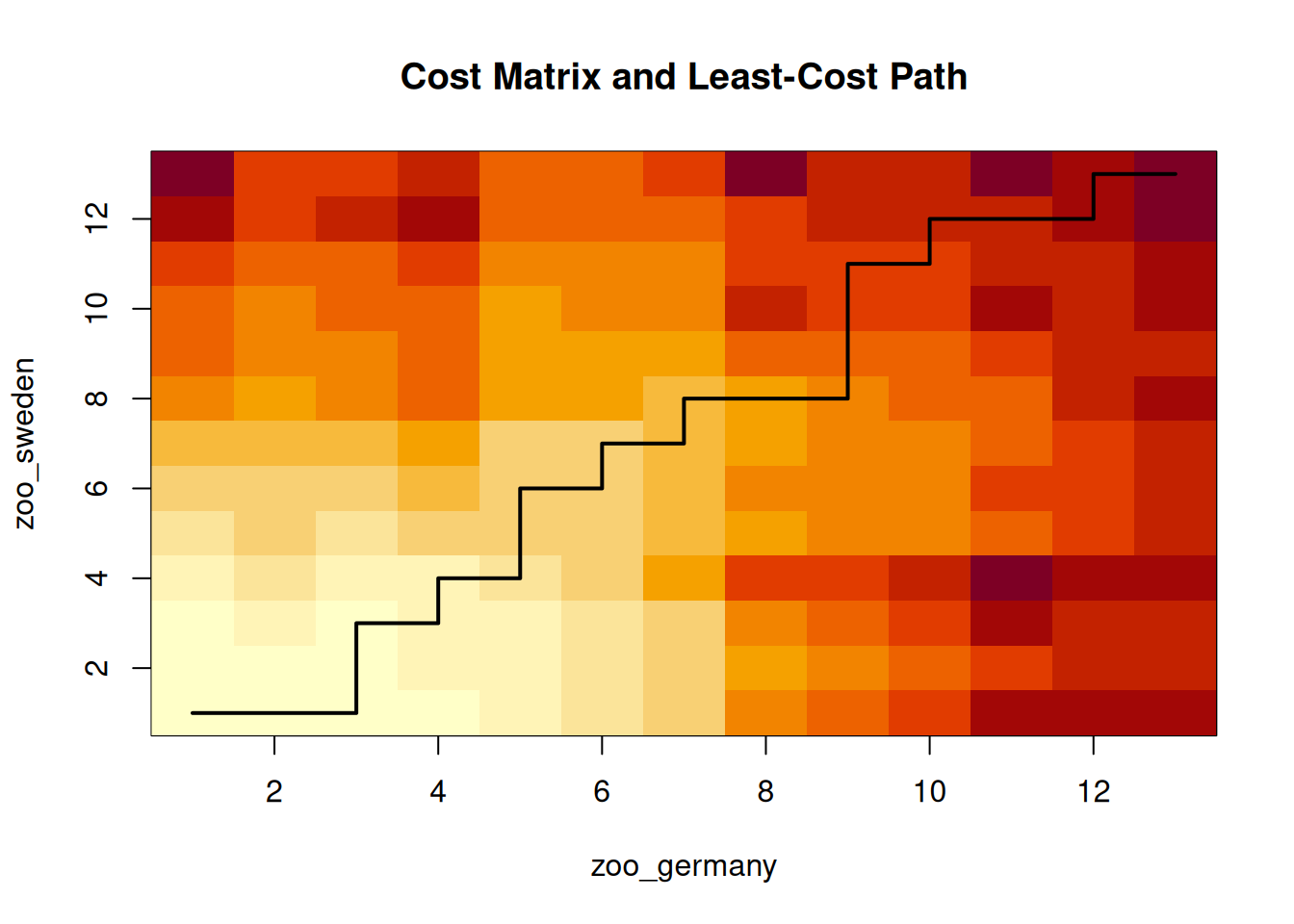 - Least-cost path: path in the cost matrix that minimizes the overall distance between two time series.