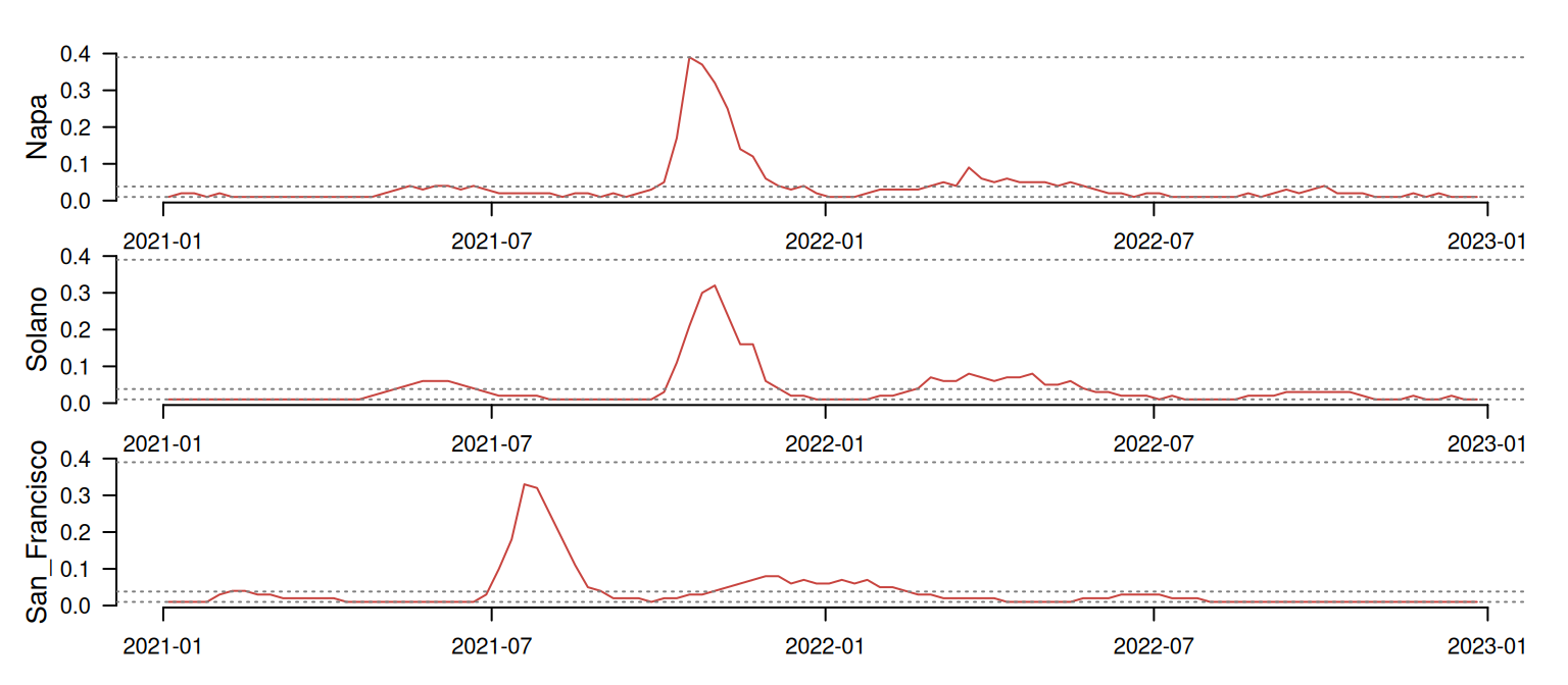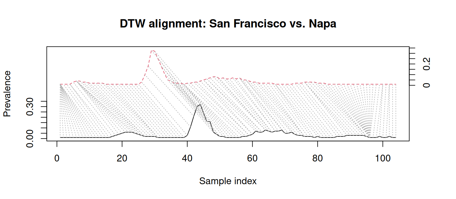 In this rather long post I’ve gone through the main functionalities in distantia that are helpful to better understand how univariate epidemiological time series are related and to explore drivers of dissimilarity. However, there are other utilities in distantia that may be useful in this field, such as network plots, which are described in the post